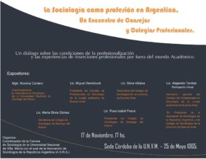 Este próximo 17 de noviembre a las 17hs, en la sede Córdoba de la Universidad Nacional de Villa María, los representantes de los Colegios Profesionales y de la Universidad, nos daremos cita para debatir sobre las condiciones de la profesionalización de la práctica sociológica y reflexionaremos en torno a las experiencias inserción profesional extra-mundo académico.