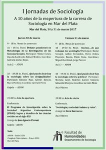 Los días 30 y 31 de marzo de 2017 se realizarán en Mar del Plata las Primeras Jornadas de Sociología de la UNMDP: “A diez años de la reapertura de la Carrera de Sociología en Mar del Plata”. Lxs invitamos a consultar la difusión y leer el programa ,nuestra Institución tendrá un papel importante en dicho encuentro. Ver Programa